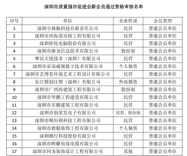 附:深圳市质量强市促进会新会员通过资格审核名单