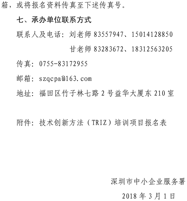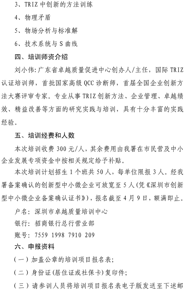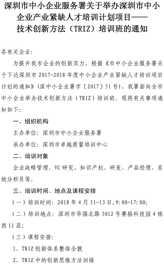 关于举办深圳市中小企业产业紧缺人才培训计划项目―― 技术创新方法(TRIZ)培训班的通知