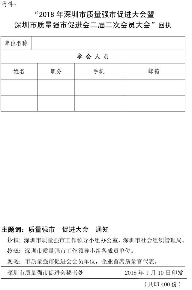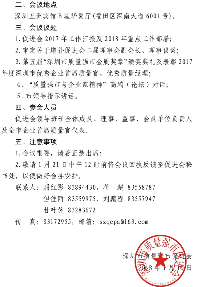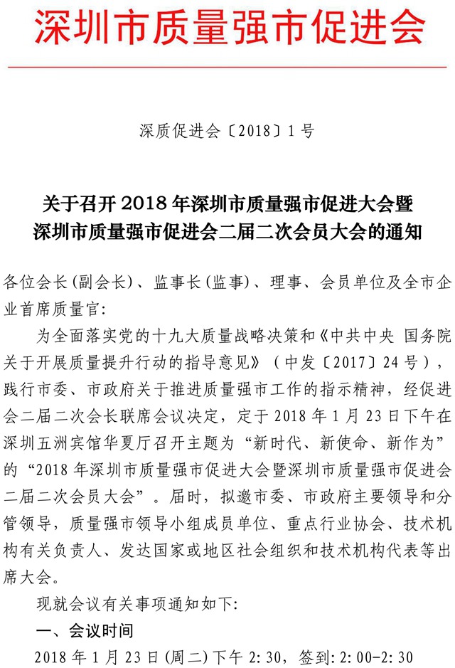 关于召开2018年深圳市质量强市促进大会暨深圳市质量强市促进会二届二次会员大会的通知