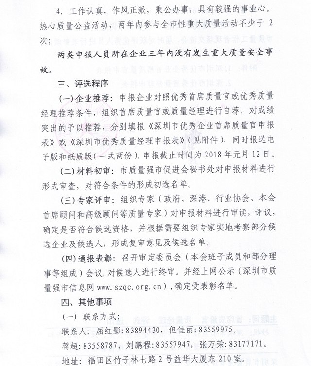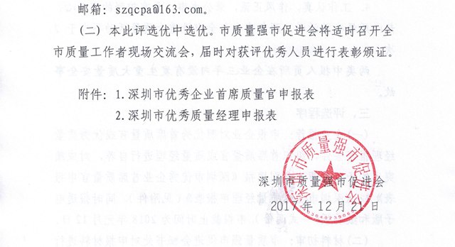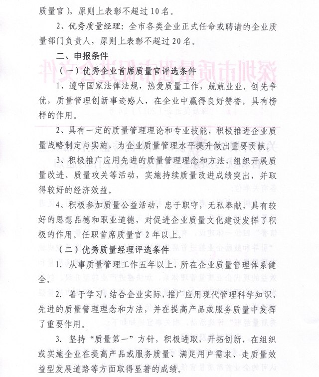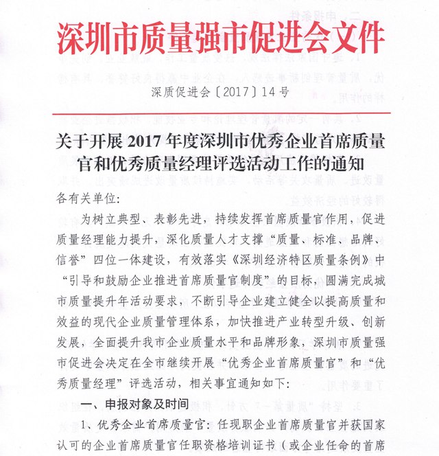 关于开展2017年度深圳市优秀企业首席质量官和优秀质量经理评选活动工作的通知