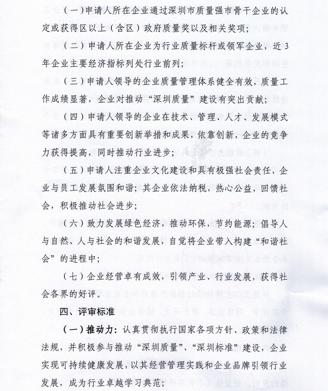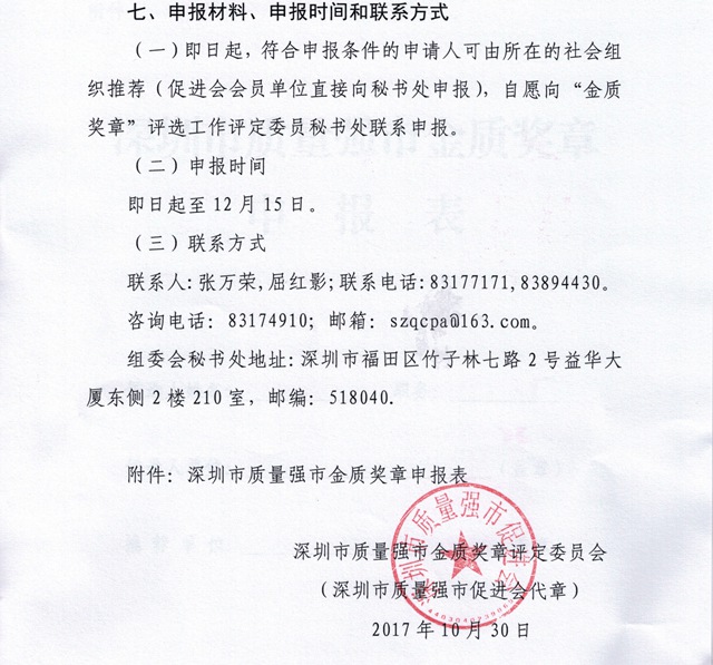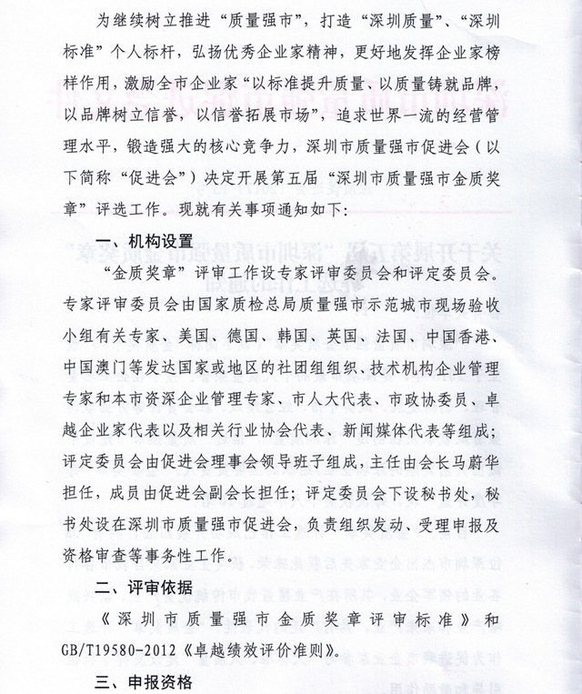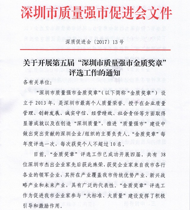 关于开展第五届“深圳市质量强市金质奖章” 评选工作的通知