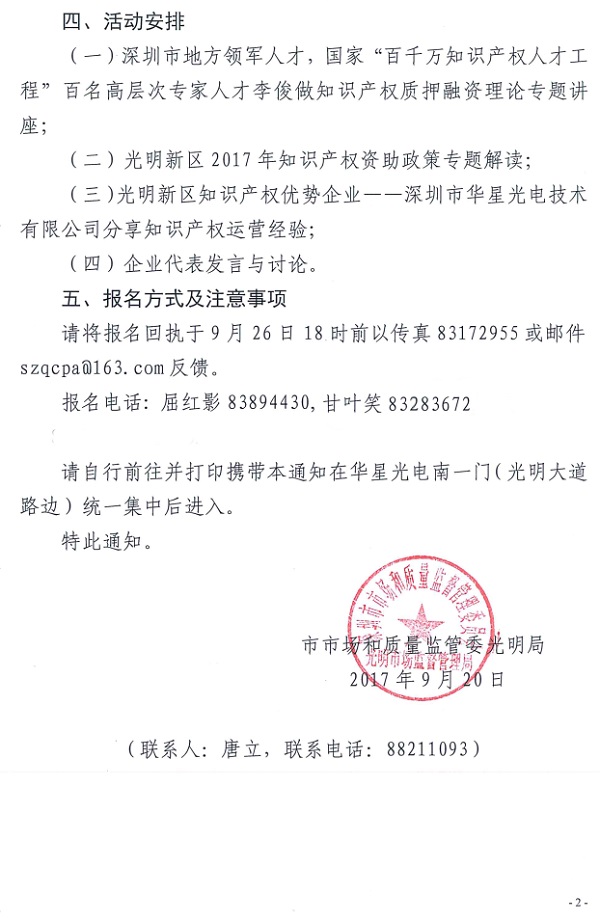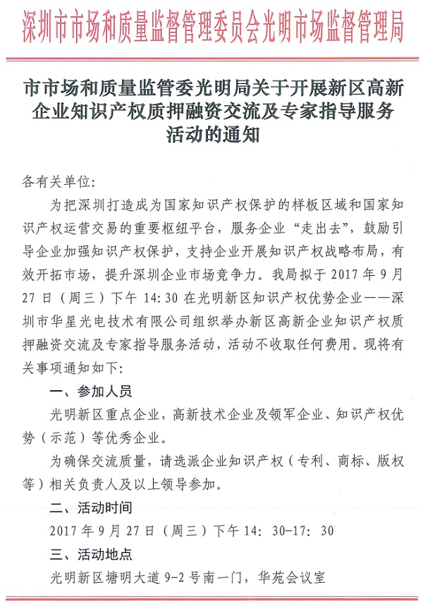 市市场和质量监管委光明局关于开展光明新区高新企业知识产权质押融资交流及专家指导服务活动的通知