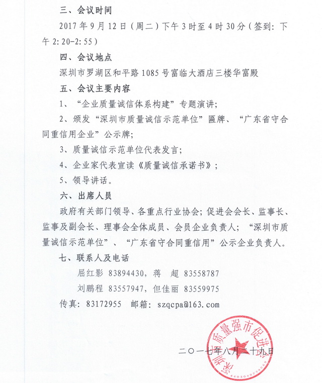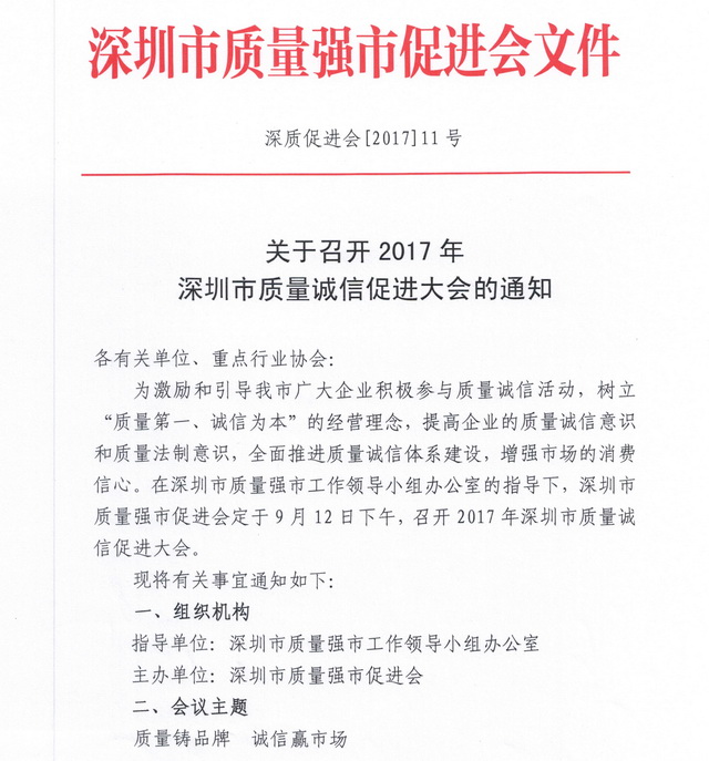 关于召开2017年 深圳市质量诚信促进大会的通知