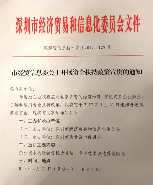 深圳市经贸信息委关于开展资金扶持政策宣贯的通知