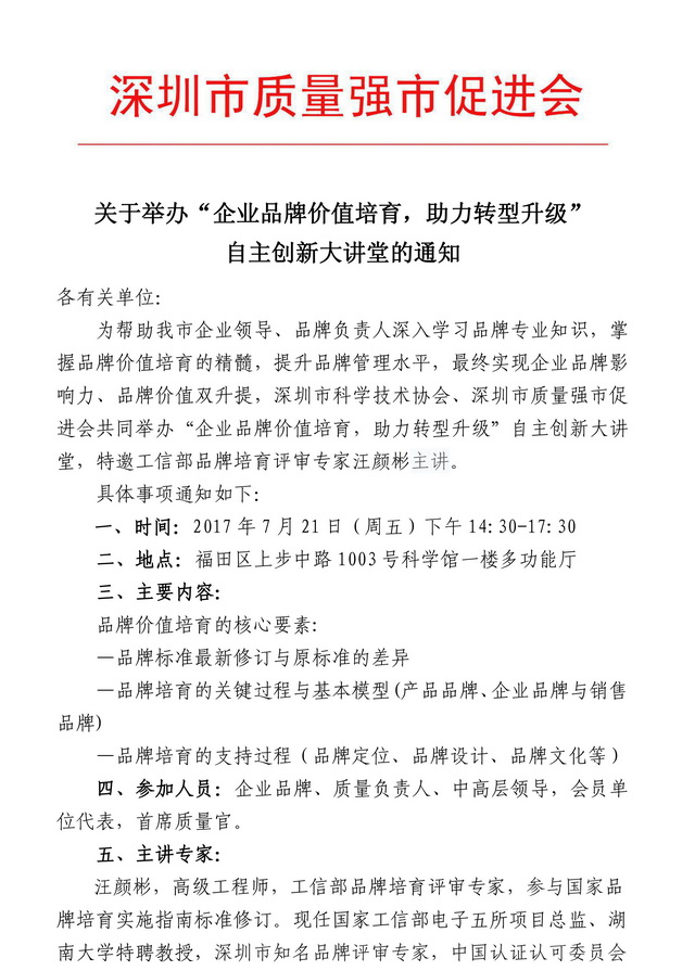关于举办“企业品牌价值培育,助力转型升级” 自主创新大讲堂的通知