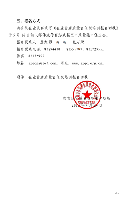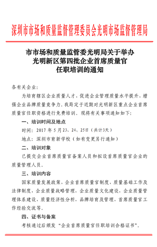 关于举办光明新区第四批企业首席质量官任职培训的通知