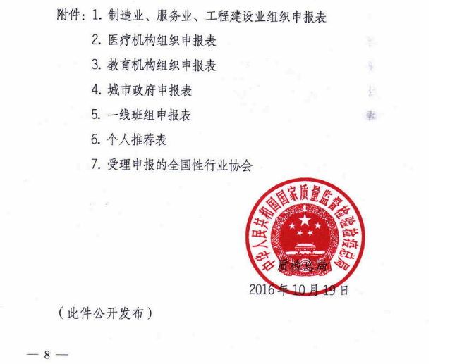 (一)参评组织范围:共9类组织,包括制造业、服务业、工程建设行业生产经营组织,国防工业、武器研发制造维修设计单位,医疗机构(仅限医院科室和专项医疗团队),教育机构(仅限小学、初中和职业技术学校),“全国质量强市示范城市”创建城市政府,一线班组(包括各领域QC小组)等。
