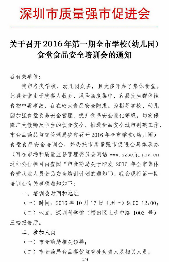 关于召开2016年第一期全市学校(幼儿园)食堂食品安全培训会的通知