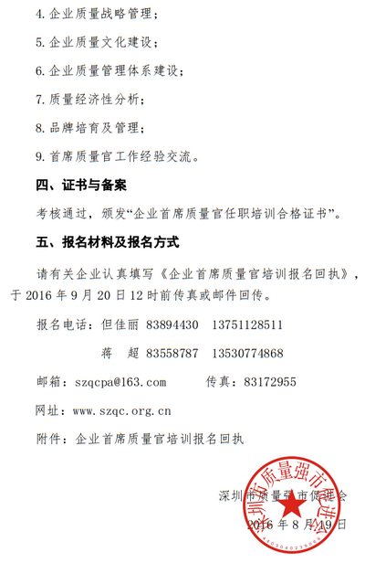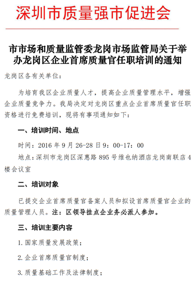 关于举办龙岗区企业首席质量官任职培训的通知