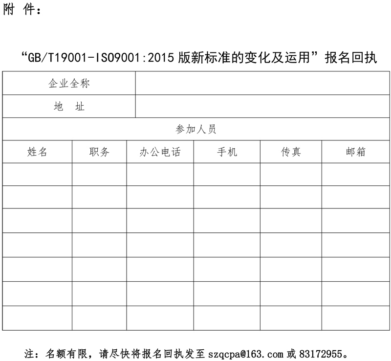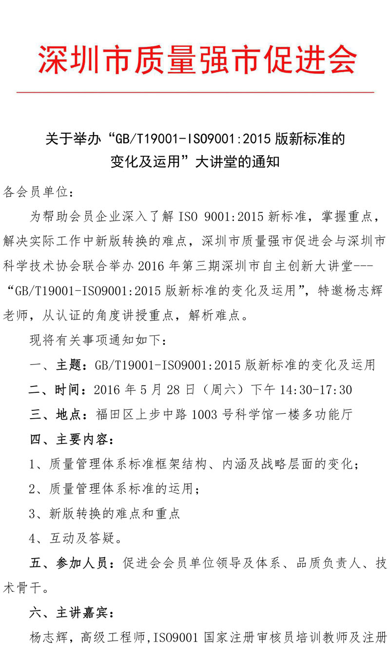 关于举办“GB/T19001-ISO9001:2015版新标准的 变化及运用”大讲堂的通知