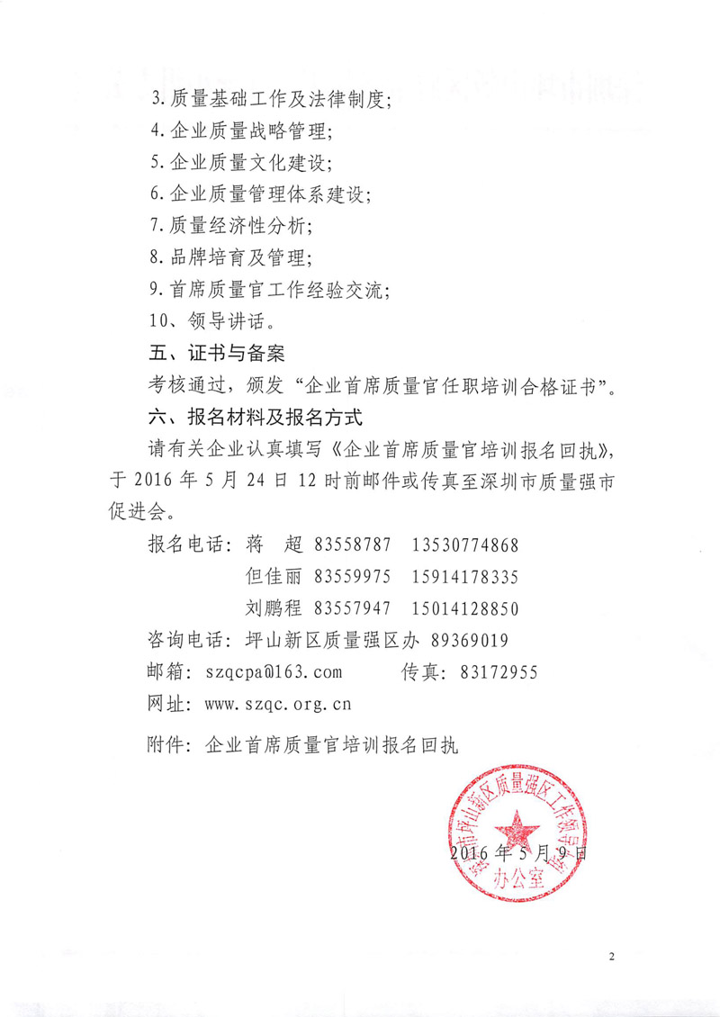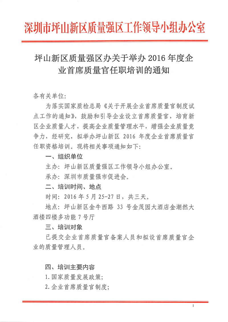 坪山新区关于举办2016年度企业首席质量官任职培训的通知