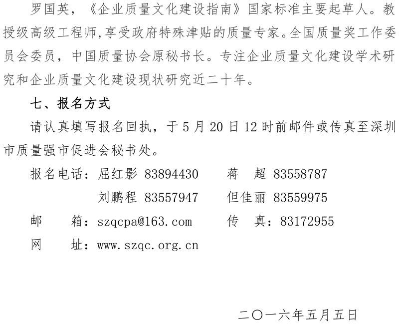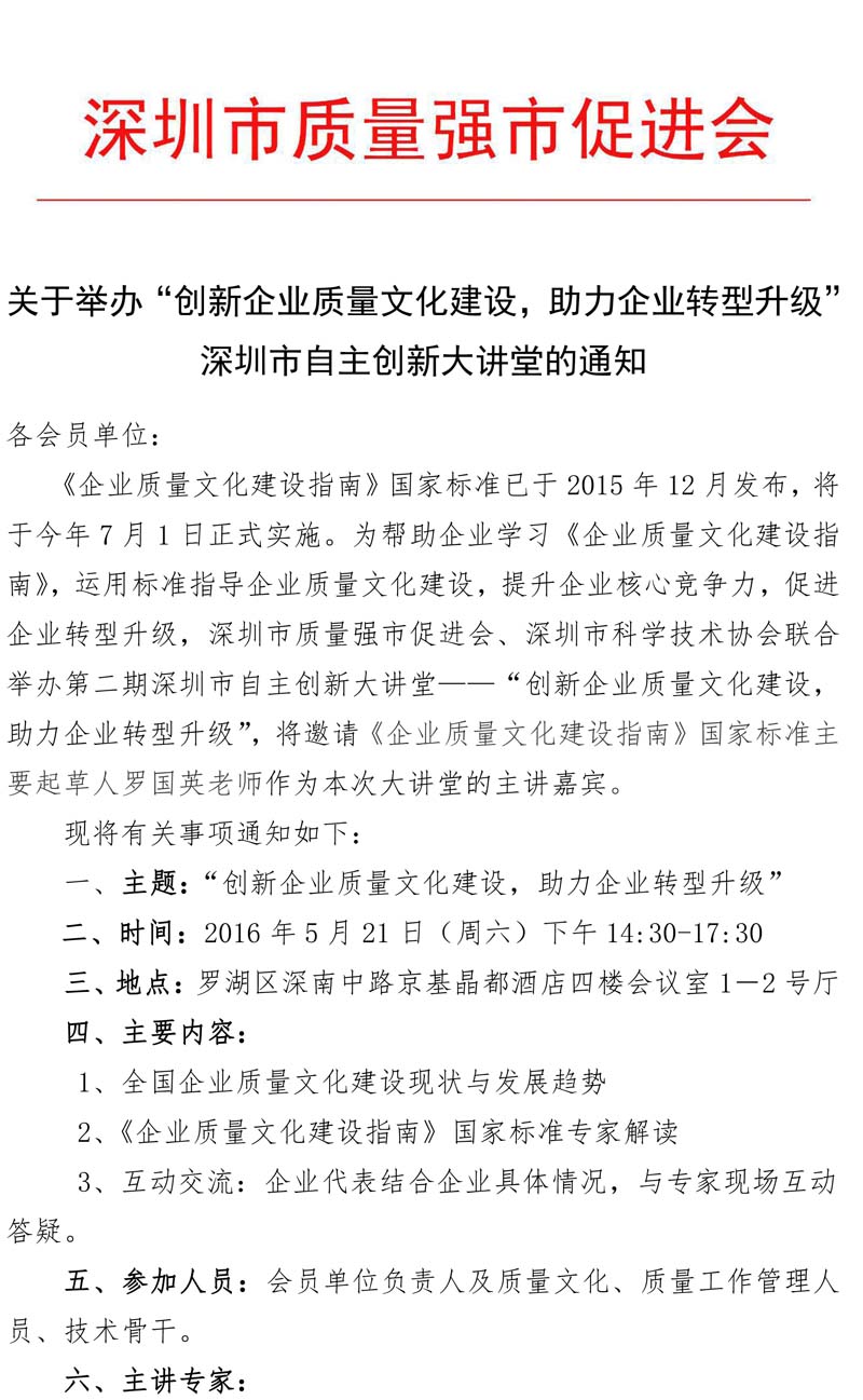 关于举办“创新企业质量文化建设,助力企业转型升级”深圳市自主创新大讲堂的通知