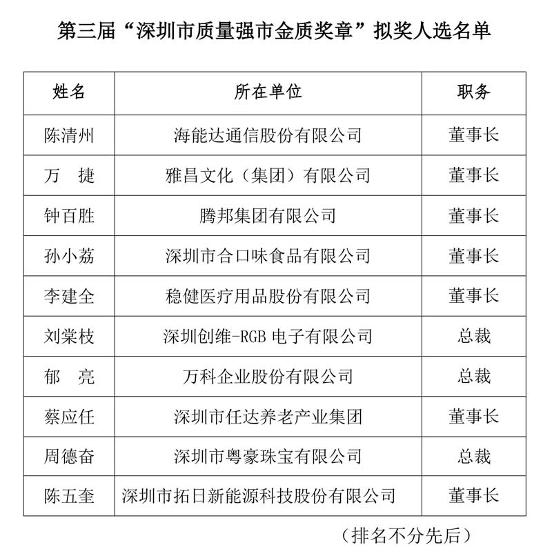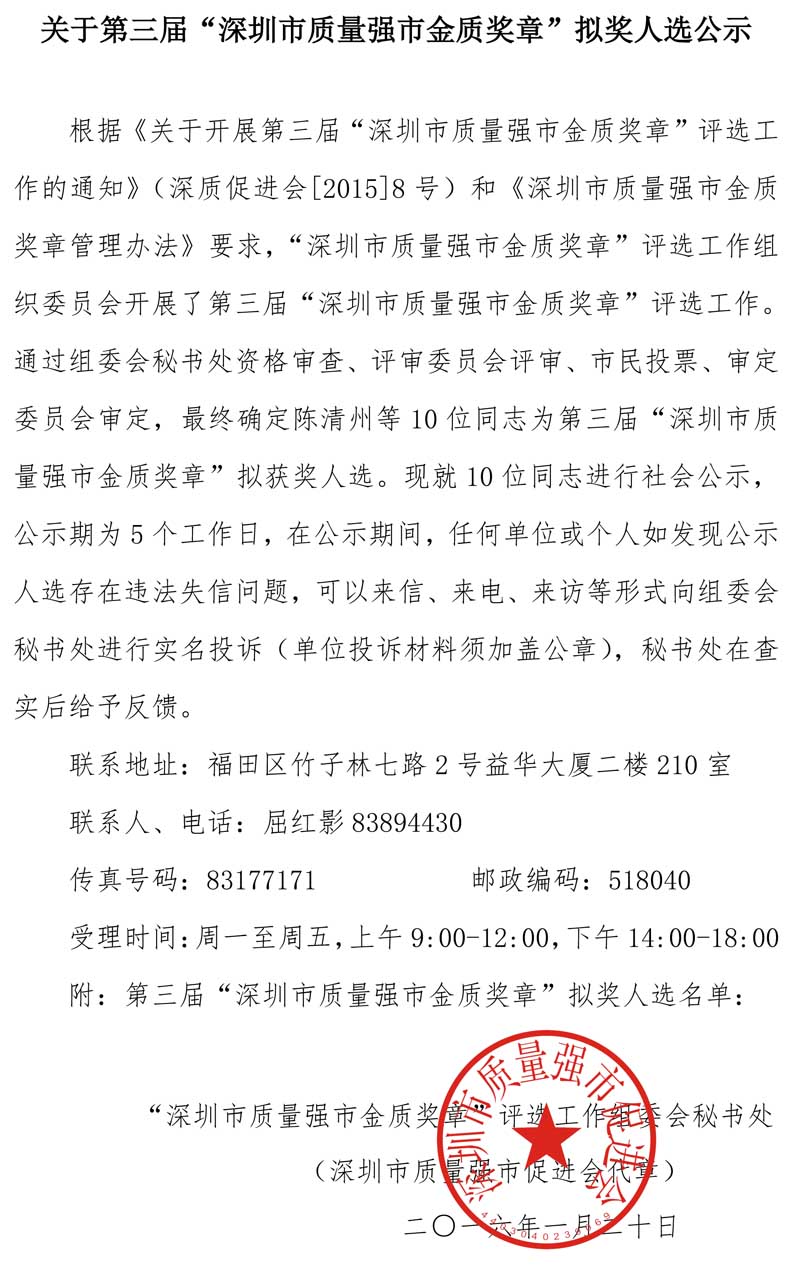 关于第三届“深圳市质量强市金质奖章”拟奖人选公示