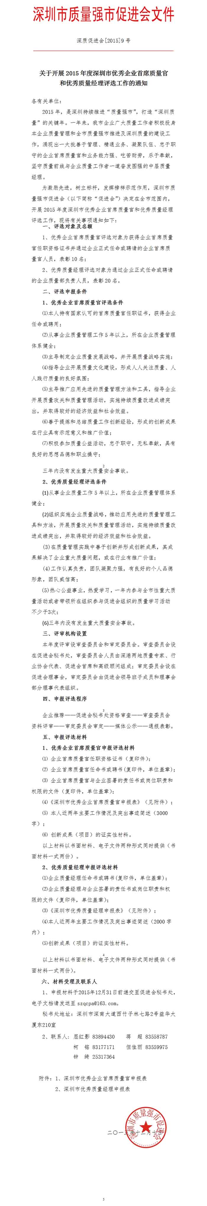 关于开展2015年度深圳市优秀企业首席质量官 和优秀质量经理评选工作的通知