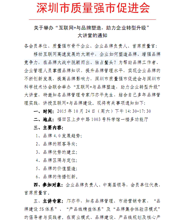 关于举办“互联网+与品牌塑造,助力企业转型升级” 大讲堂的通知