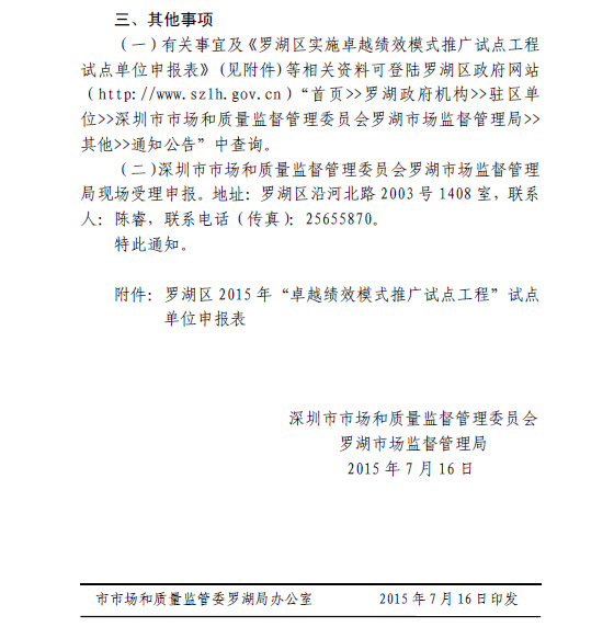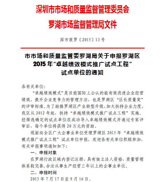 市市场和质量监管委罗湖局关于申报罗湖区2015年“卓越绩效模式推广试点工程” 试点单位的通知