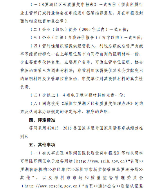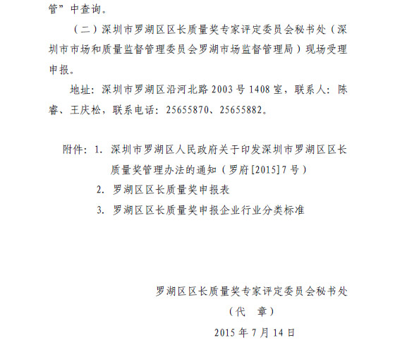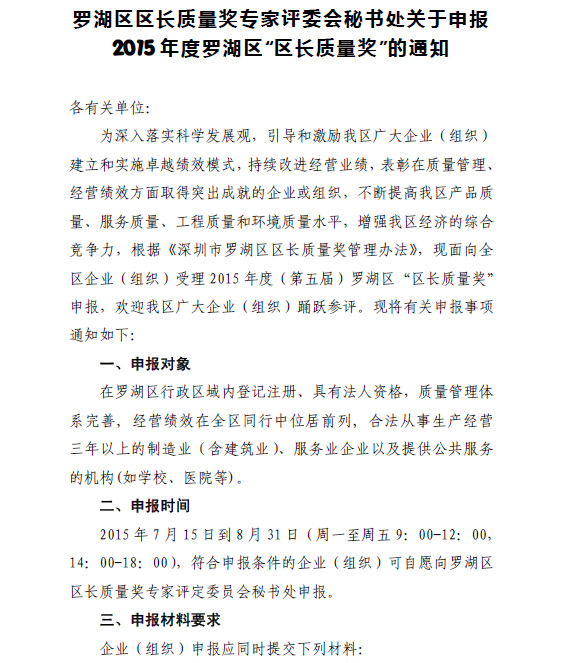 罗湖区区长质量奖专家评委会秘书处关于申报2015年度罗湖区“区长质量奖”的通知