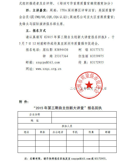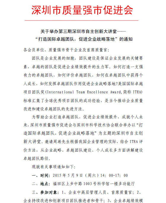 关于举办第三期深圳市自主创新大讲堂―― “打造国际卓越团队,促进企业战略落地”的通知
