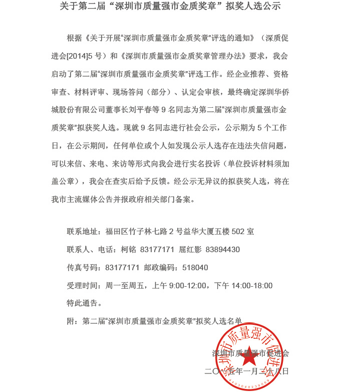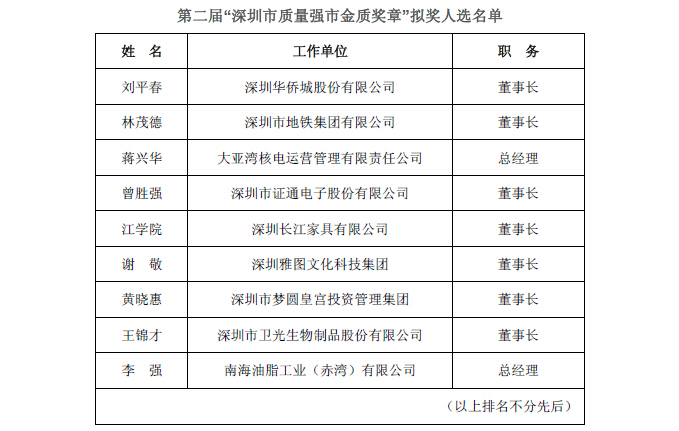 关于第二届“深圳市质量强市金质奖章”拟奖人选公示