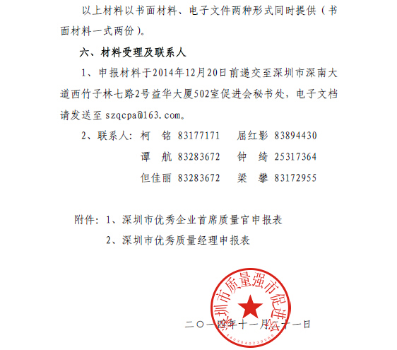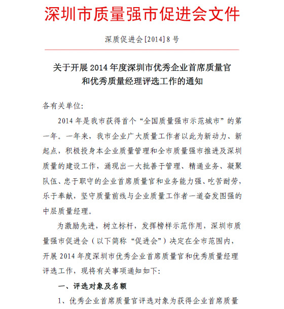 关于开展2014 年度深圳市优秀企业首席质量官和优秀质量经理评选工作的通知