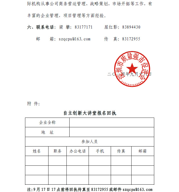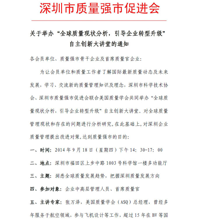 关于举办“全球质量现状分析,引导企业转型升级”自主创新大讲堂的通知