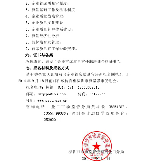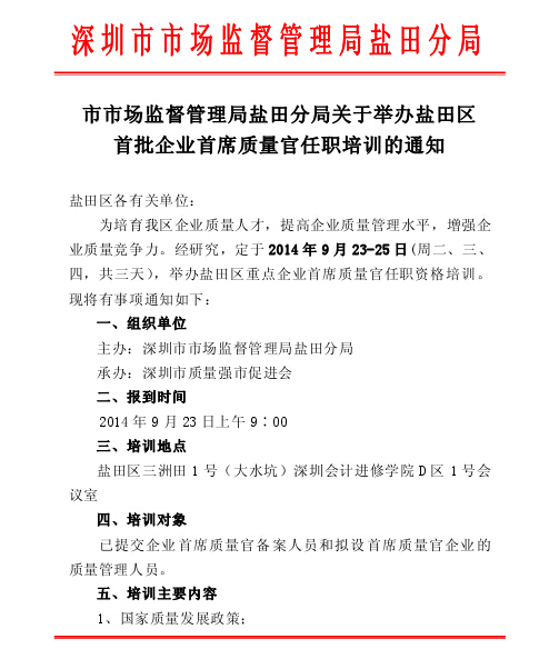 关于举办盐田区首批企业首席质量官任职培训的通知