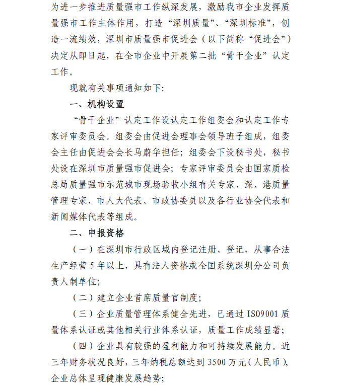 关于开展第二批“深圳市质量强市骨干企业” 认定工作的通知