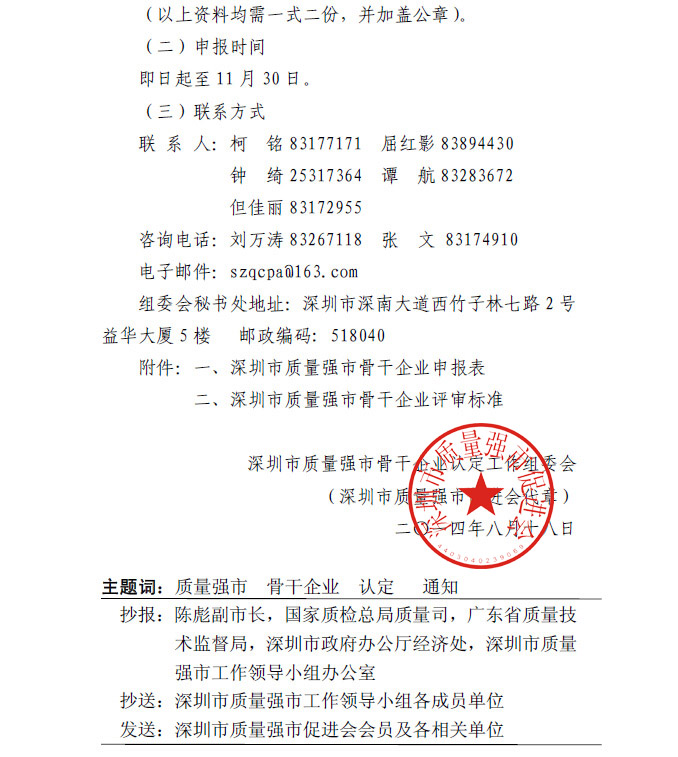 关于开展第二批“深圳市质量强市骨干企业” 认定工作的通知