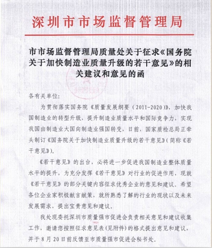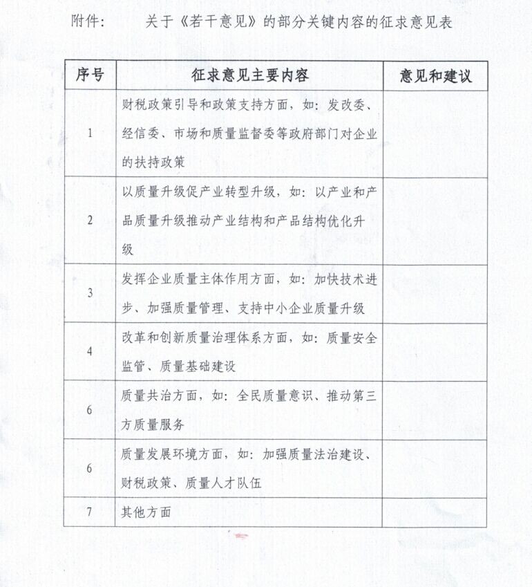关于征求《国务院关于加快制造业质量升级的若干意见》的相关建议和意见的函