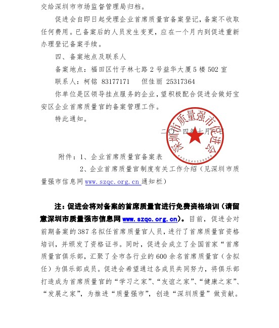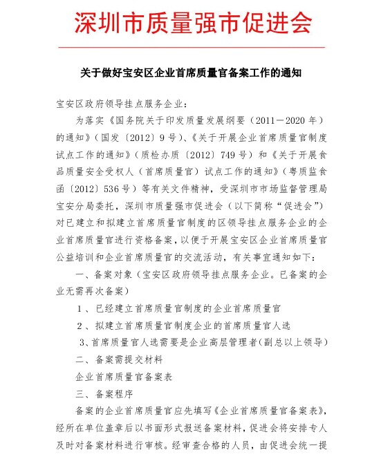 关于做好宝安区企业首席质量官备案工作的通知