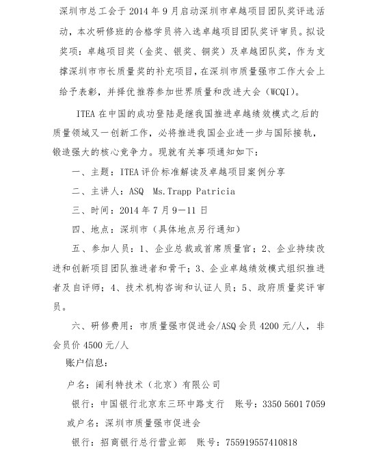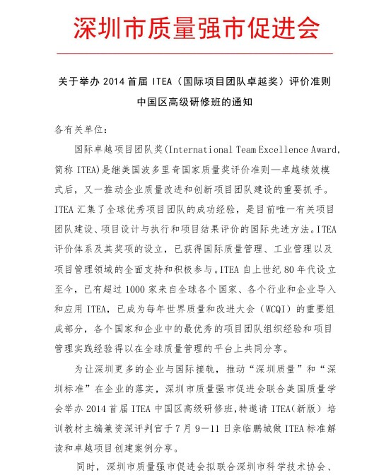 关于举办2014首届ITEA(国际项目团队卓越奖)评价准则中国区高级研修班的通知