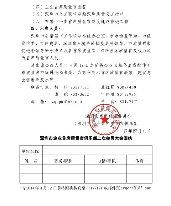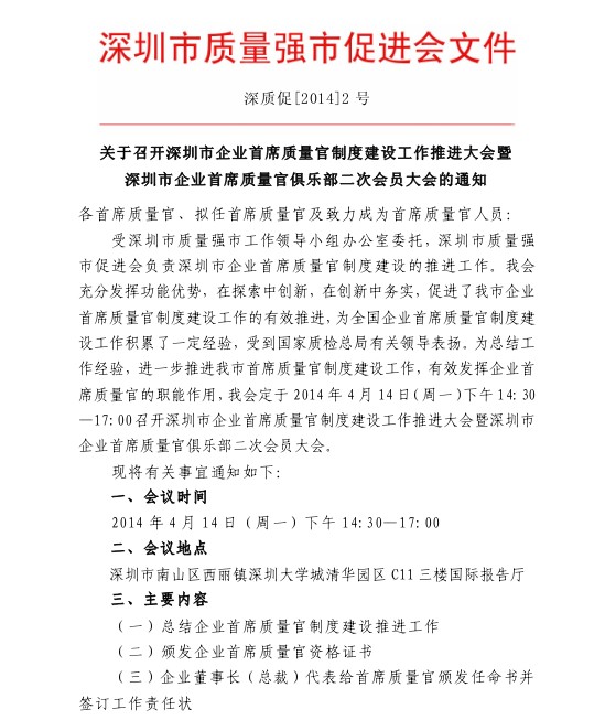 深圳市企业首席质量官俱乐部二次会员大会的通知