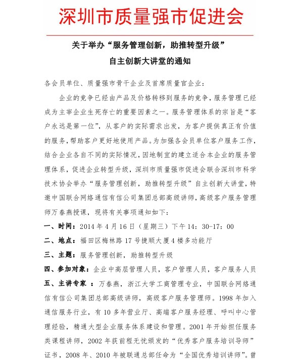 关于举办“服务管理创新,助推转型升级”自主创新大讲堂的通知