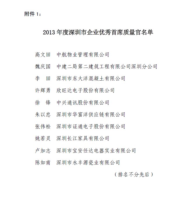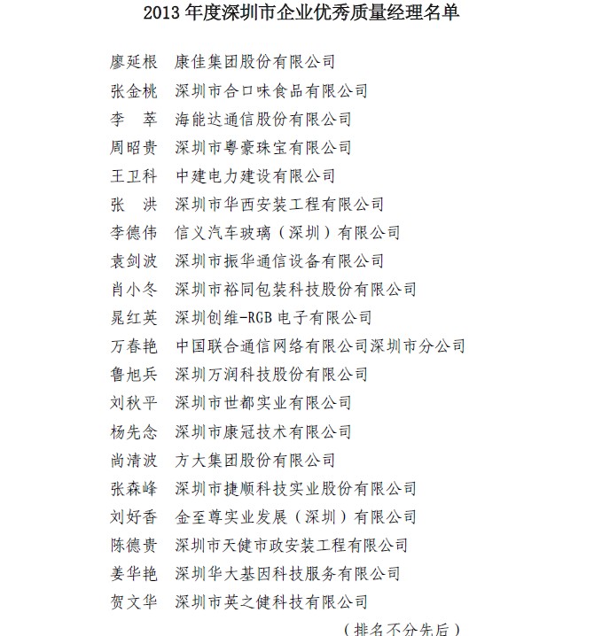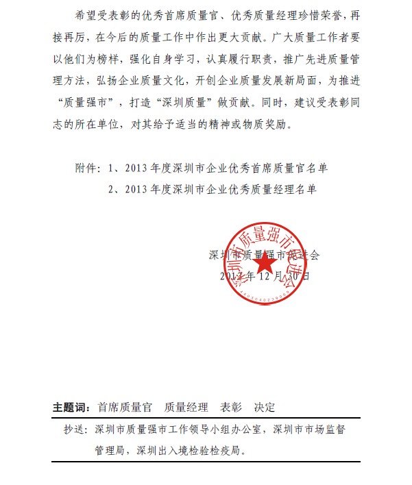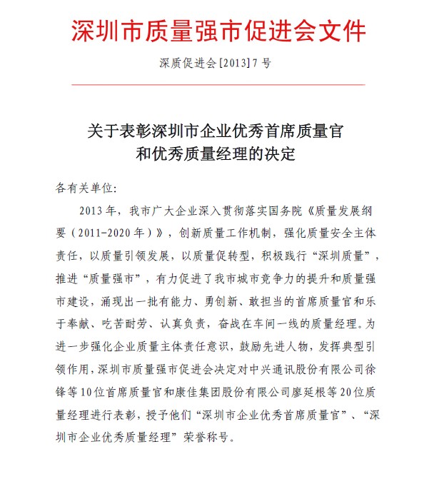 关于表彰深圳市企业优秀首席质量官和优秀质量经理的决定