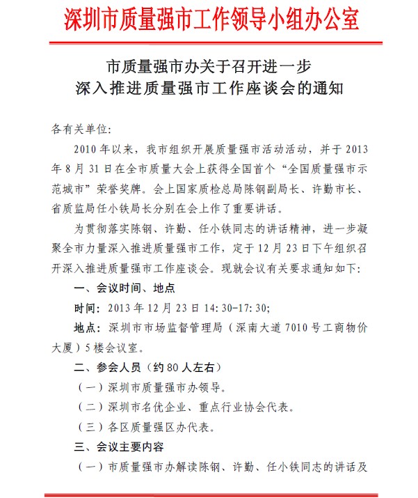 市质量强市办关于召开进一步深入推进质量强市工作座谈会的通知