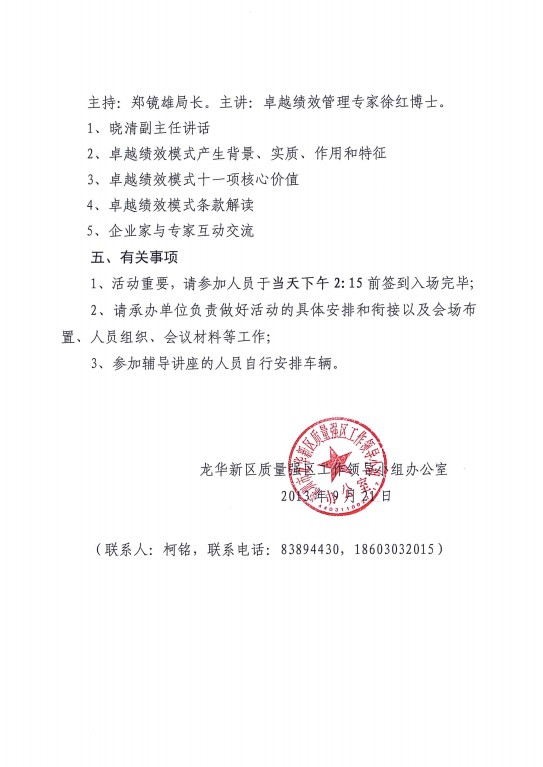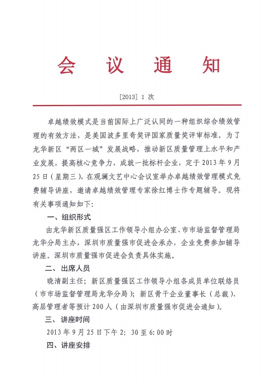 龙华新区举办卓越绩效管理模式辅导讲座的通知
