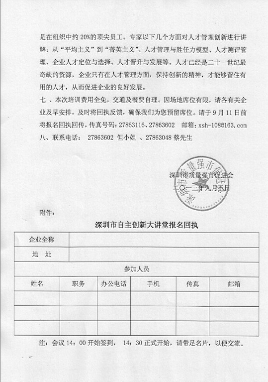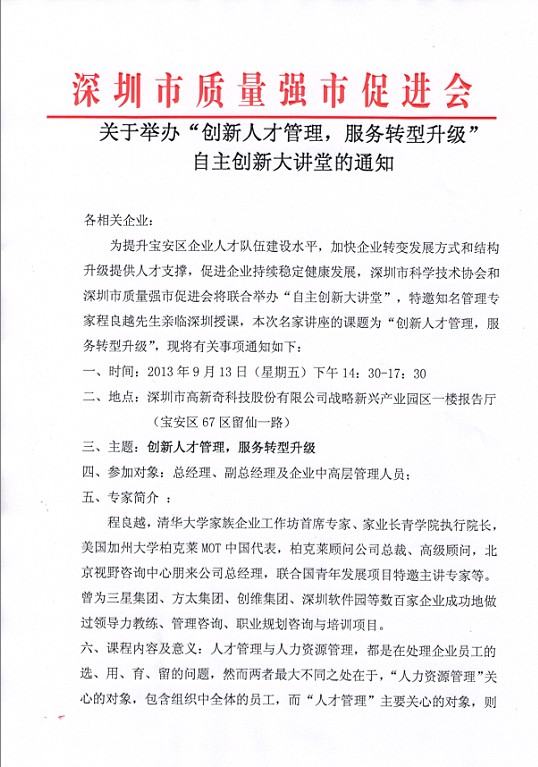关于举办“创新人才管理,服务转型升级” 自主创新大讲堂的通知