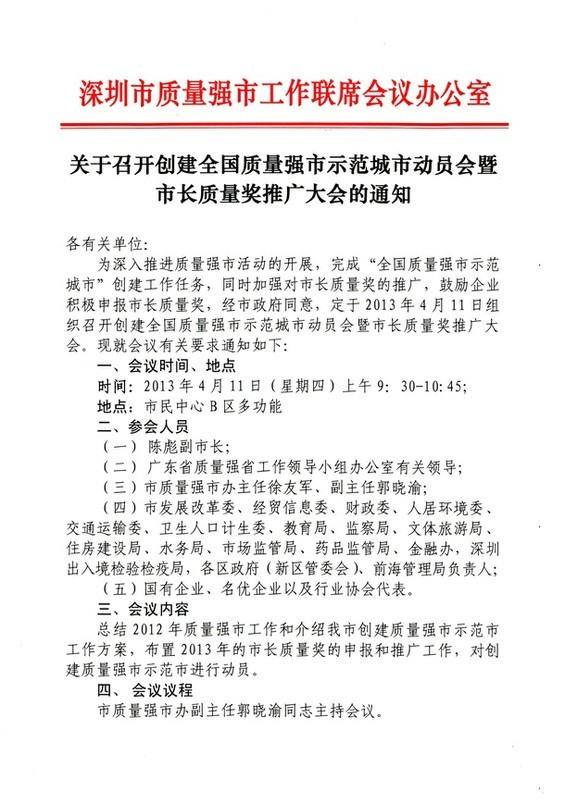 召开创建全国质量强市示范城市动员会暨市长质量奖推广大会的通知